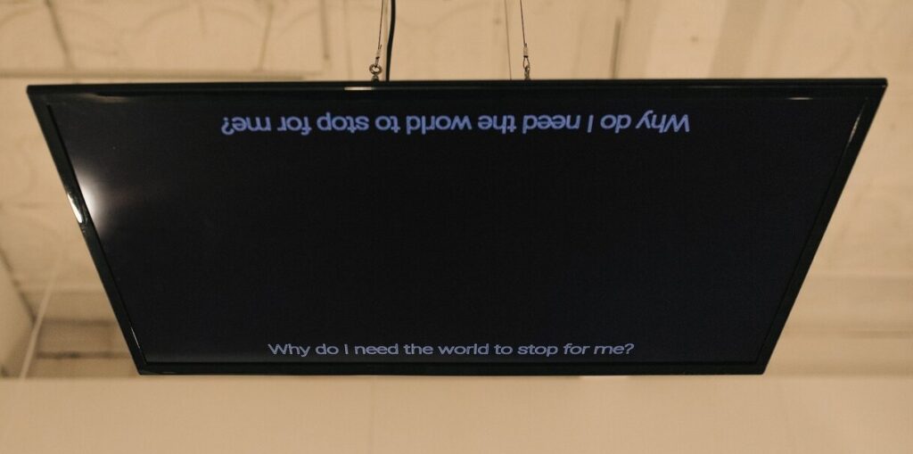 The artist’s choice of placing those devices in front of the viewer where areas for rest are provided is a strong attempt of direct communication, like a face-to-face interaction. The television screen only displays subtitles for the narration on a black background, in ghostly hollow letters with white outlines.