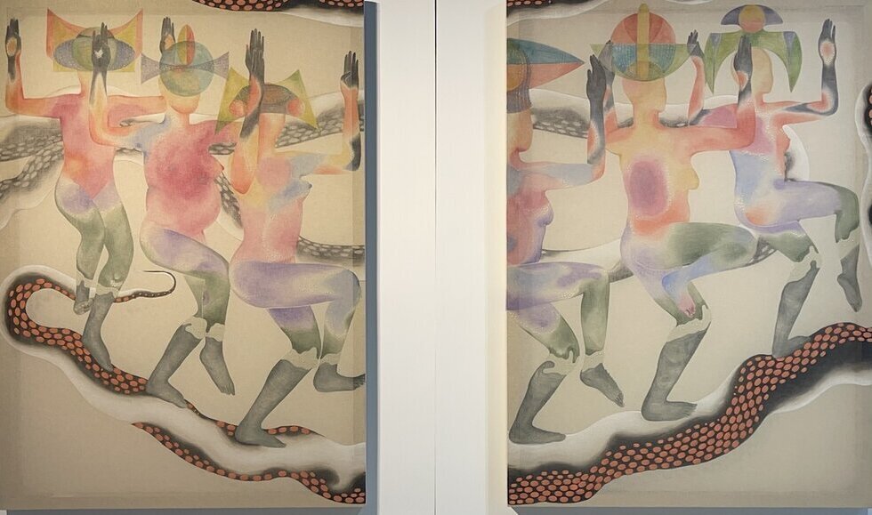 Rajni Perera, Joyous Procession/The Infinite Serpent, 2024. Acrylic gouache, polymer, clay, metallic thread on polyester fabric, glass and freshwater pearls, chalk, charcoal, 213.3 x 152.4 cm each. Courtesy of the artist and Patel Brown Gallery. Photo: Sherry Qin