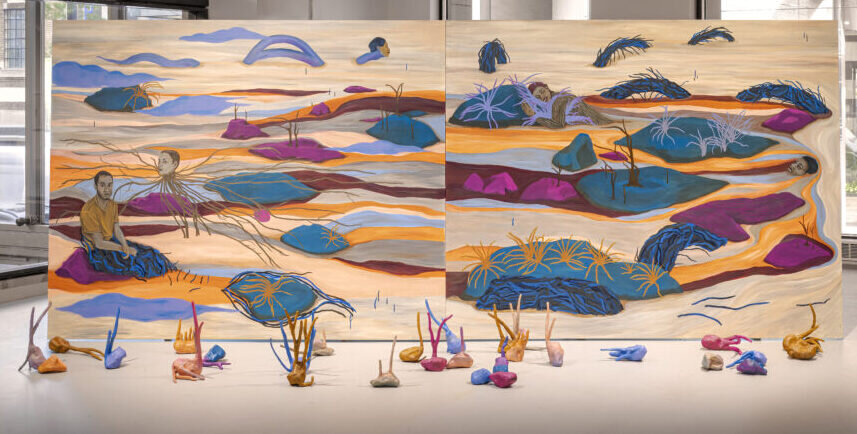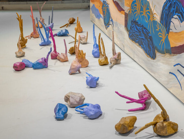 Tessa Mars, All Islands Touch, 2024. Acrylic on canvas, and papier-mâché. Paintings: 200 x 250 cm each. Installation: dimensions variable. Courtesy of the artist. Photo: Toni Hafkenscheid