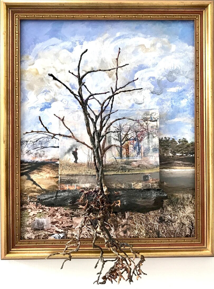 Patella cites Robert Rauschenberg as an inspiration for her unique photo-based mixed media practice. Rauschenberg is most known for what are called Combines; he would use found objects in his artwork, transforming everyday objects into something new by its change of context. Similarly, Patella would collect a myriad of things from the burn sites to integrate into her artwork. For example, a large piece of log is placed along the bottom frame of “Hawk Hill Burn” as if the photograph, along with some twigs, are growing right out of it. A log being used as a bottom frame is a motif that Patella repeats in many of her pieces. Sometimes, the log is positioned at the bottom of a wood panel already within a larger canvas, where a twig and its root are emerging from it, like in “West Rd., High Park with Forester”; an awe-inspiring metaphor for the cyclical quality of nature, that from the burnt wood, new life can arise.
