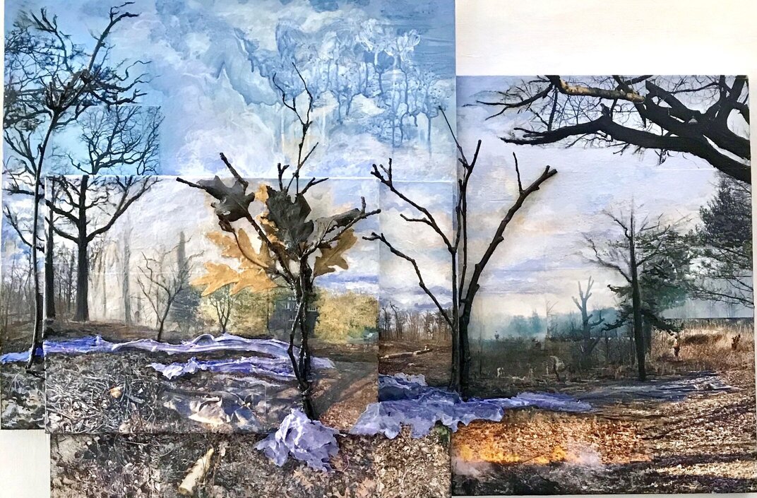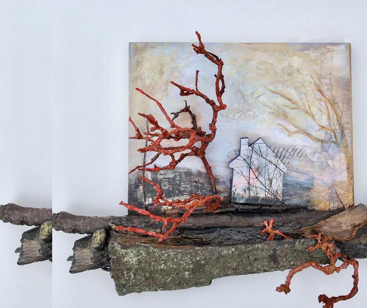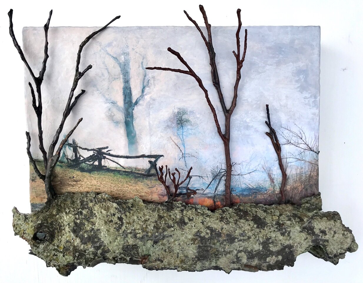 In addition to photography, collaging, carpentry and the creative integration of nature, Patella paints directly onto the photos or the collected twigs and leaves. She delicately paints atmosphere into her scenes, like hazy smoke dissolving into a clear blue sky, or a majestic tree cloaked by the dancing fumes of a recently extinguished fire. In one piece, a twig is painted completely in a vibrant red, producing a stark contrast from the smoke-filled photographic backdrop, recalling the power that nature possesses. Patella blurs the lines between painting and three-dimensional sculpture that pulls viewers into her carefully-crafted reality where art is nature, and nature is art.