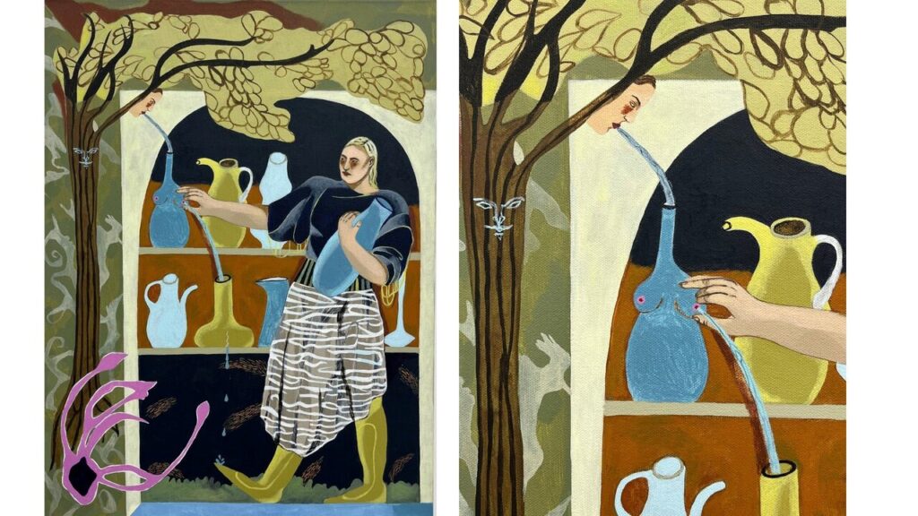 “Feminine Apothecary” captivated me with its evocative narrative. The tree is depicted in a minimalist way, with branches extended over a woman’s figure. The mouth of a face on the tree branch pours water into a female-shaped vase. The woman, standing in front, expresses water from the nipple that falls into another vase, then onto the woman’s foot and finally falls back to the ground watering it – so the circle is complete.