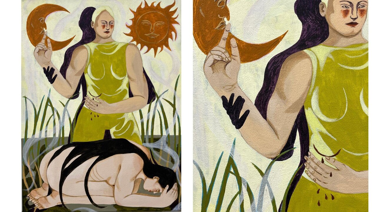 “Correct Attitude” got my attention because of its profound symbolism. Several details stand out, each contributing to its rich narrative that can be interpreted in many ways. The central figure, a woman, is enveloped by a dark shadow from behind, suggesting a sense of foreboding. There is a moon-shaped cut on her right side. With her left hand she tries to stop the bleeding, while her right hand points at the moon. A naked woman is lying at her feet, face down in a position of worship. It suggests that the woman dressed in gold could be a Goddess consecrated to the Moon, properly honoured by the human. The worshipper’s nakedness and her long hair spreading over her body brings sexuality into the composition.