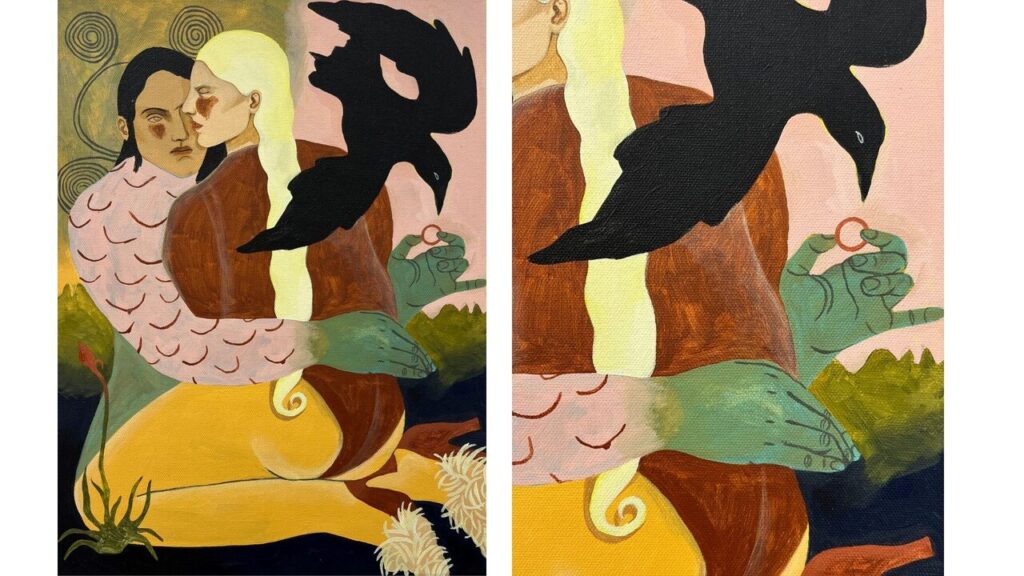 “In a Field near Hatfield House” features two figures appearing to embrace, each of them distinct in their symbolic representation. One of them has green hands, hips and arms and upper body covered with fish scales accompanied by hollow, open eyes – suggesting a sea-creature. The other figure, a human woman, dressed entirely in a striking red bodysuit with matching high heels, has her eyes closed. Adding to the intrigue, the figure with green hands holds a red ring concealed behind the woman’s back, while a black crow is flying toward it.