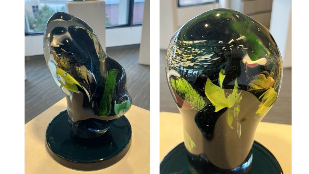 Alfred Engerer is a distinguished artist known for adeptly channelling personal experiences, historical insights, and emotional reflections into evocative sculptural works. In “Coral Garden,” Engerer masterfully employs solid worked glass to create a captivating coral-inspired sculpture that invites viewers to explore its intricate details. The artist’s use of a vibrant colour palette, featuring hues of green, yellow, blue, and red, accentuates the delicate layered complexity of the piece, reflecting Engerer’s deep connection to the natural world and its mesmerizing beauty.