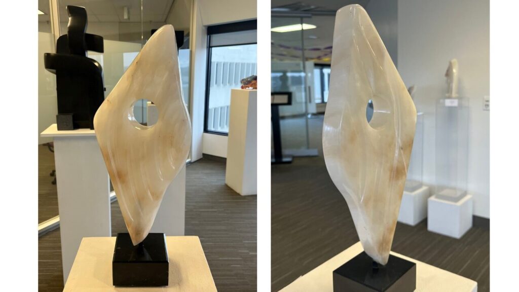 Tom Ashbourne is a self-taught sculptor who specializes in stone as a medium. Through the skillful manipulation of colour, shapes, and texture he created “The Dancer,” an innovative work that transcends the conventional constraints of sculptural techniques. Crafted from calcite, this sculpture exquisitely captures the dynamic essence of dance while simultaneously inviting viewers to engage with its abstract and thought-provoking elements, most notably the strategically carved central void that disrupts the fluidity of the piece and compels contemplation.