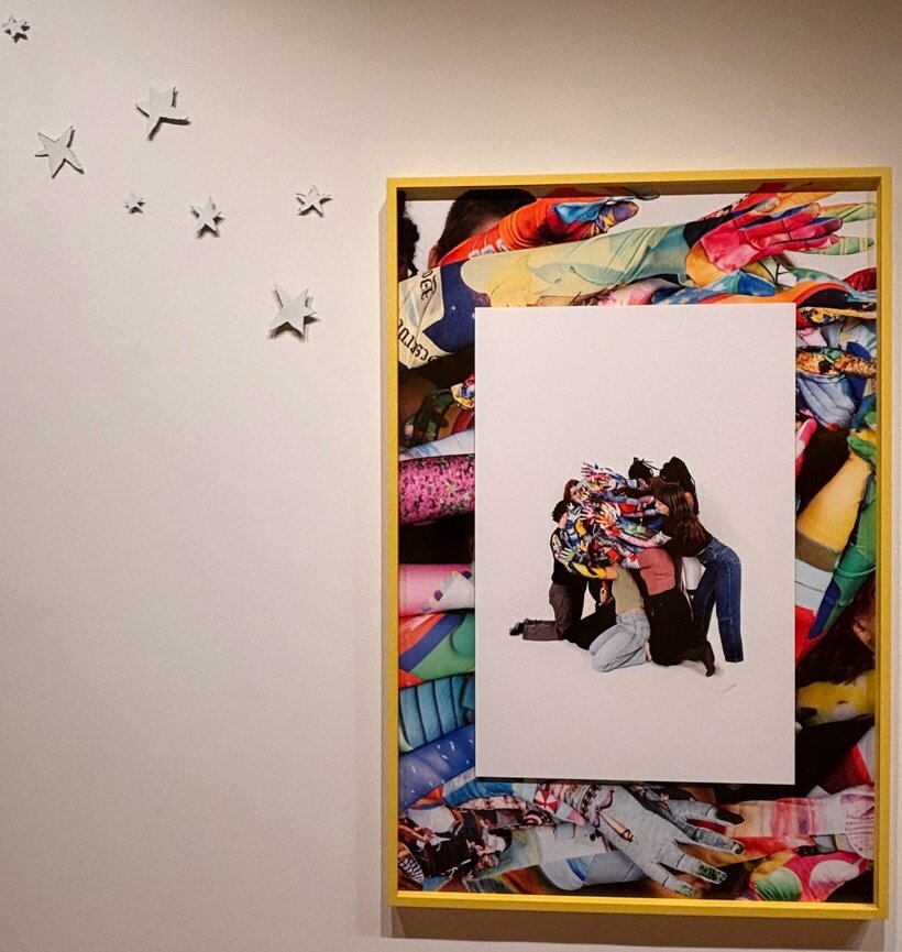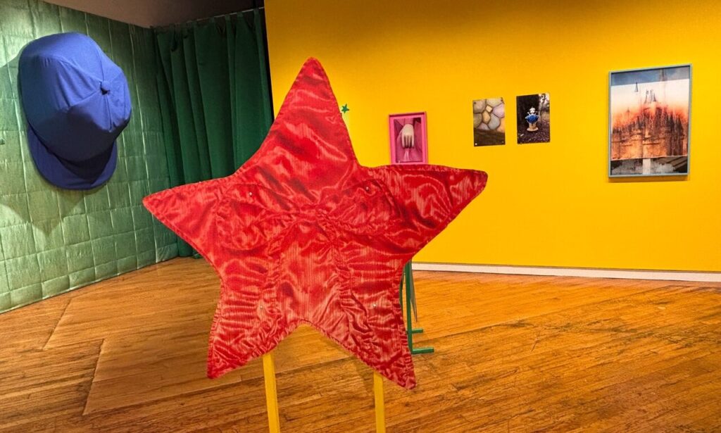 Upon entering Hannah Doucet’s Exiting the Castle at Gallery 44, one becomes filled with a longing nostalgia for one’s childhood playrooms. A sprawling pile of colourful rubber wands and sparkling fruit, set against a glowing yellow wall, creates a striking first impression. Above are silver stars reminiscent of the ones your parents may have stuck to your ceiling so you could go to bed and not face the monster beneath it. Large plastic stars rise from the ground, each wrapped in photos of layered, vibrant fabric. Similarly, the gloves reaching out from the wall depict images of cartoons, flowers, and toys – symbols of innocence. The finishing touch is a comically large blue baseball hat hanging off a pastel green wall, accompanied by some more sparkly fruit. The scene created by Doucet evokes the pure joy, hopefulness and carefree spirit of childhood.