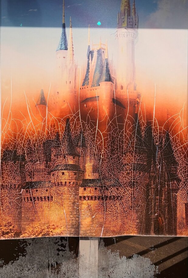 Upon closer examination, some of these photographs reveal off-putting aspects in notably enchanting figures and locations. The images now seem out of place in the playroom, as the structures photographed, which date back to the early ’90s, have lost their charm over time and with the context that Doucet’s “Wishmaking™” provides. For instance, a poster displayed in a Florida storefront appears out of place in the “whimsical” exhibition, as it bluntly showcases a fractured poster of a castle reminiscent of Cinderella’s Castle in Disney World.
