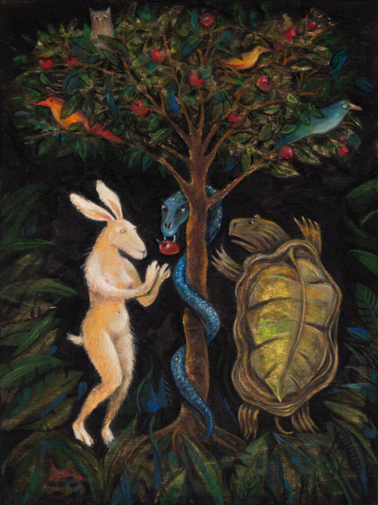 In one of the paintings, the figures of Adam and Eve are replaced by the Tortoise and the Hare, a fable about a race between characters of unequal abilities, where trickery instead of perseverance and grit, was used to prevail and gain power over the stronger opponent. Klunder’s interpretation suggests the inequality between Adam and Eve, between man and woman, and the manipulation of Eve to commit the original sin.