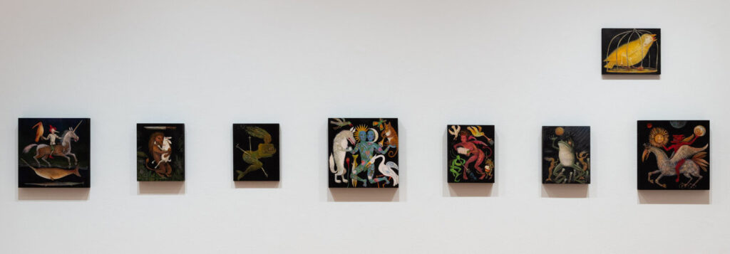 Medieval fables and folklore are more specifically referenced in the new collection of small gouache on wood paintings. In the artist’s statement, Klunder mentions Hieronymus Bosch as inspiration. He was a Renaissance painter, also using wood as a canvas, whose works are highly imaginative, complicated, bustling scenes rich in symbolism and allegory. The connection between the art of Bosch and Klunder’s art is quite obvious, though Klunder’s works aren’t just a rehashing of medieval paintings or fables. Instead, she combines different elements from familiar stories into one image, revealing something new about them, and bringing these historical folktales into the 21st century.