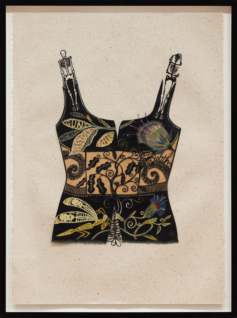 Barbara Klunder, Shotguns from BulletProof Vests, 2013, paper-cut and collage, 29 ½ x 21 ¼ inches