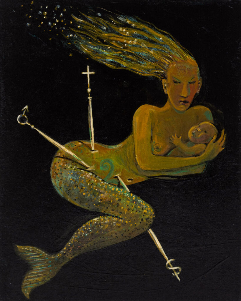 In another piece, the Little Mermaid cradles an infant in her arms, while three swords pierce her body. Each pommel on the hilt of swords displays a symbol: there’s Mars symbol of the male gender, a crucifix, and a serpent. The three swords is a reference to the tarot deck in which the Three of Swords represents pain, sorrow, and betrayal. One can discern that this painting is about the hurtful aspects of motherhood that come from the patriarchy and religion, and also how humans hurt the environment and its creatures.