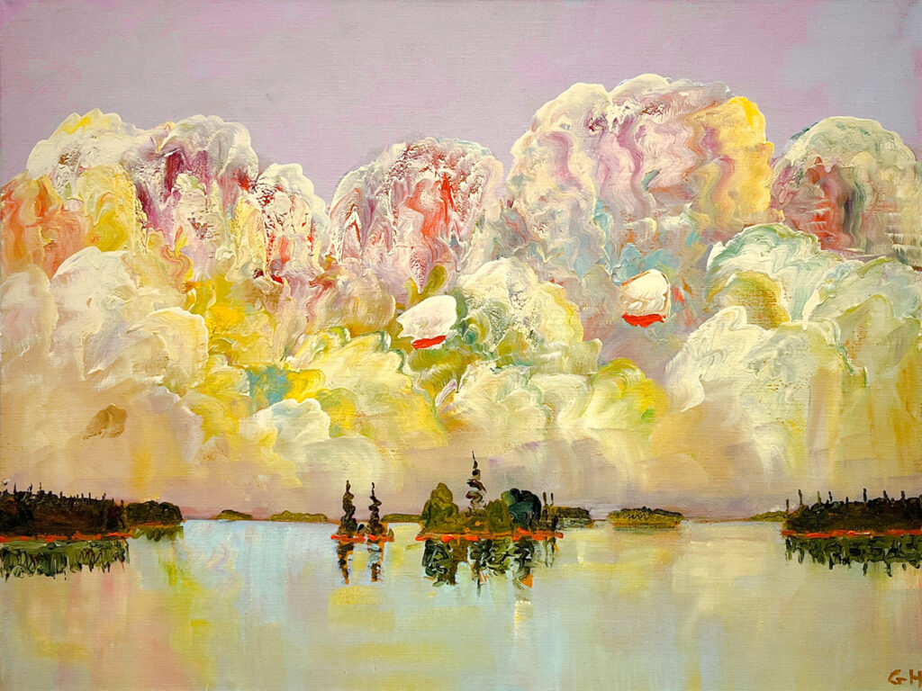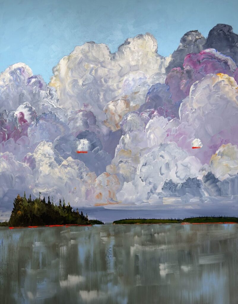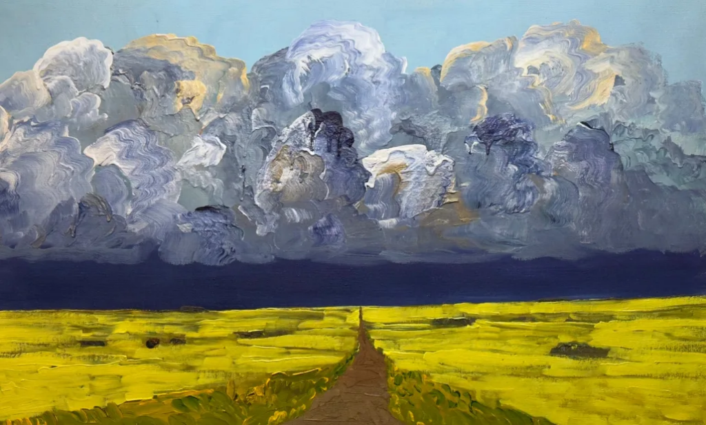 A signature of Hardy’s landscapes is his unique way of expressing clouds. Among the flatlands and prairies of Saskatchewan that are evoked in the paintings, the sky dominates. Hardy captures the sky’s majesty with voluminous clouds. During the artist’s talk at the opening reception, Hardy compared the sky to a stage set, where the clouds are the actors themselves, moving around, with, or against each other. The clouds don’t statically stand above you, but they confront and approach you.