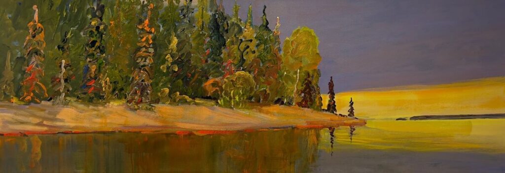 Greg Hardy, Shoreline Glowing, 2024, acrylic on canvas, 30 x 84 inches. ©Greg Hardy, courtesy of Nicholas Metivier Gallery.