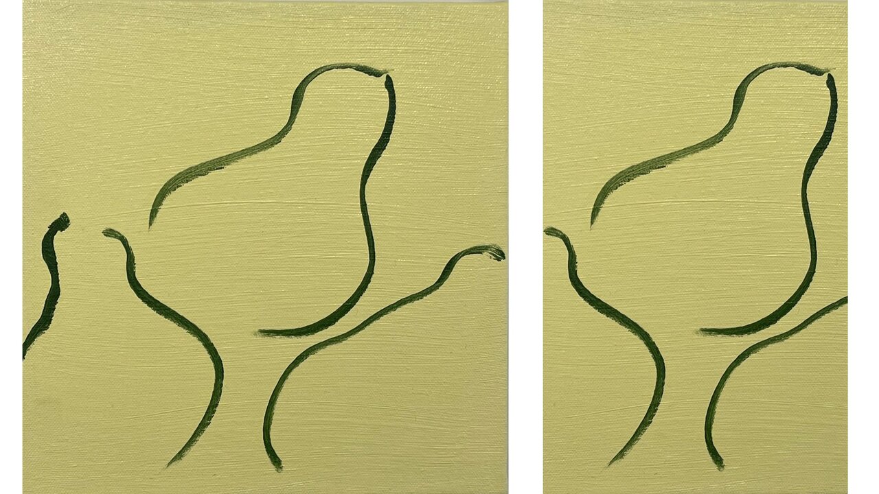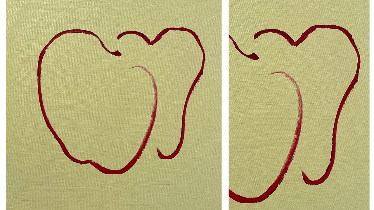 When viewed within the broader Distant Fruit series, the themes of isolation and connection become very pronounced. In “Distant Fruit 2”, Gwen Tooth presents three simple pears, their proportions evoking human figures. Each pear stands apart, reinforcing the significance of distance in the composition. The way they are positioned creates a subtle tension; an unspoken relationship between them that suggests something beyond the physical space they occupy. The negative space between the pears becomes just as expressive as the forms themselves, encouraging viewers to interpret the emotional or psychological dynamics at play. This separation aligns seamlessly with the themes Tooth explores in her artist statement. Her artistic practice is not merely about depicting fruit but about capturing her personal, emotional, and psychological states translated onto the canvas. The use of simple green lines in “Distant Fruit 2” mirrors her process of drawing with paint, where the act of holding the brush firmly and completing each line in one movement fosters a sense of continuity and immediacy. Just as she describes letting the paintings guide her, the viewer is drawn into an open-ended dialogue with the work, engaging with the imagery on a deeply personal level.