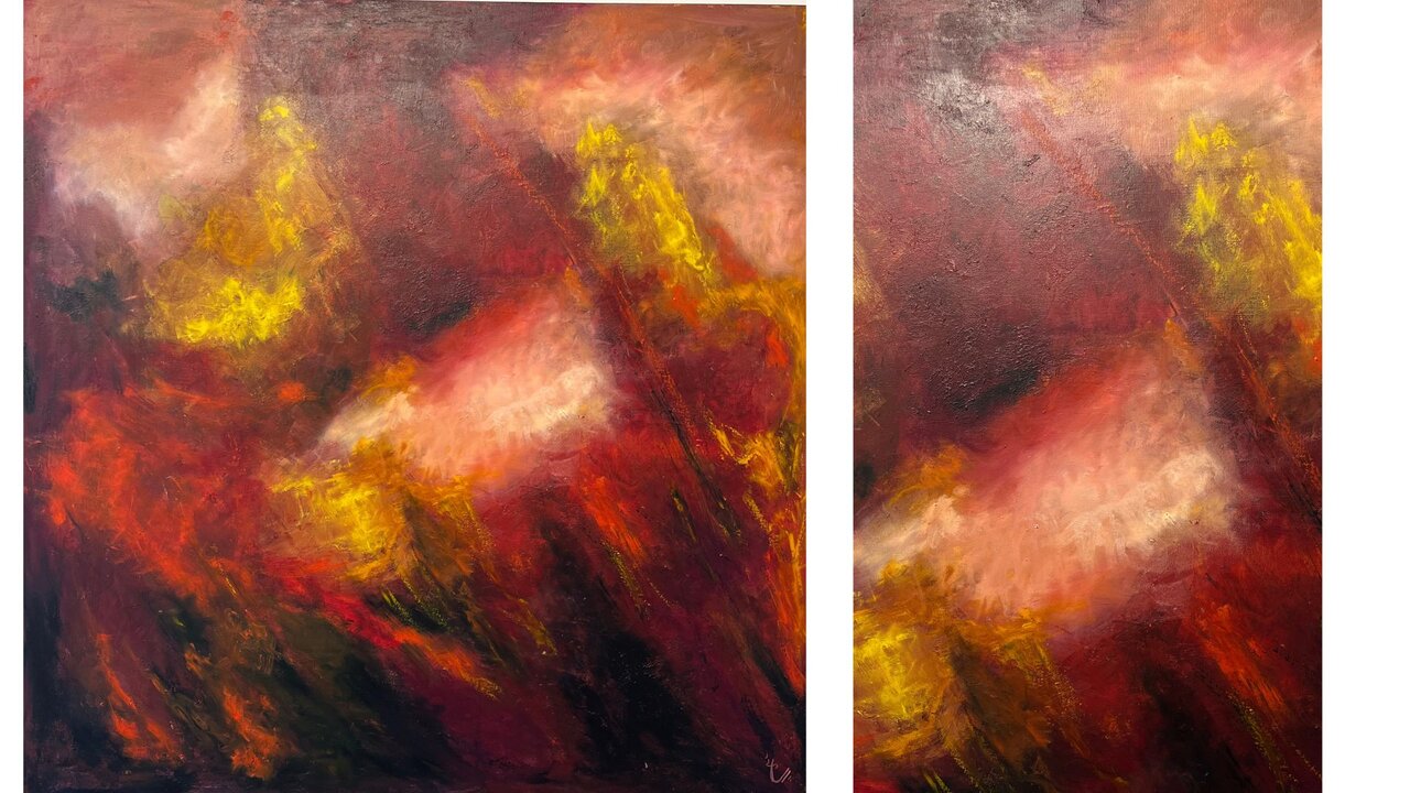 “Conquer of Hope” by Parissa Daie is a mesmerizing journey into a dreamscape, a composition that feels as though it has been pulled from the depths of memory and suspended on canvas. The use of pinks, yellows, and vibrant shades of red creates an atmosphere that is deeply emotive. Looking at the painting, it feels as if stepping into a dream, a space where time dissolves, and emotions take precedence over form. What captivates me most about this piece is the way the colours interact, blending in a manner that suggests both control and spontaneity. The brushstrokes feel intuitive, guided by an internal rhythm that mirrors Daie’s connection to her work. This aligns with her description of painting as an act of unearthing, a process of reaching into the past and pulling forth fragments of experience, stitching them together to form something tangible. The dreamlike quality of “Conquer of Hope” is heightened by the way light and texture interact on the canvas. There are moments where the colours seem to pulse, as though infused with their own life force. For instance, the warmth of the reds and yellows is tempered by the softness of the pinks, creating a balance between passion and serenity. It is in this balance that the painting truly thrives, offering a sense of comfort in this dreamlike state.