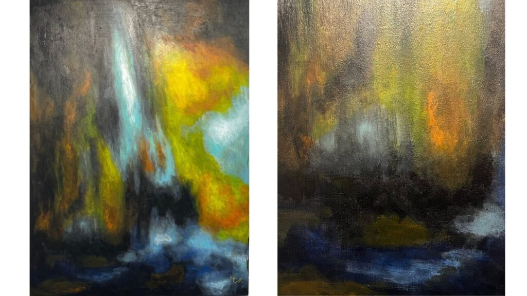Parissa Daie’s “Fall over Fire” is an evocative exploration of nature’s duality, capturing both its sombre stillness and its vibrant unpredictability. The painting immediately strikes me with its mix between muted tones and sudden bursts of luminous colour. It carries a depth, like a waterfall caught between dusk and dawn where its permanence and movement are an everlasting tension. Daie’s artistic approach, as revealed in her statement, is deeply rooted in memory, imagination, and the subconscious. She describes her process as one of retrieval, of resurrecting moments that exist between dream and reality. What draws me in most is the paradox of the piece; it feels both heavy and weightless. The darker hues envelop the scene in a kind of melancholic mystery, while the bursts of fiery colour hint at an unseen energy. I sense an eternal moment suspended in paint. It makes me wonder, are we witnessing something fading, or something being born? Is this a landscape of memory, or one waiting to be formed in our own minds?