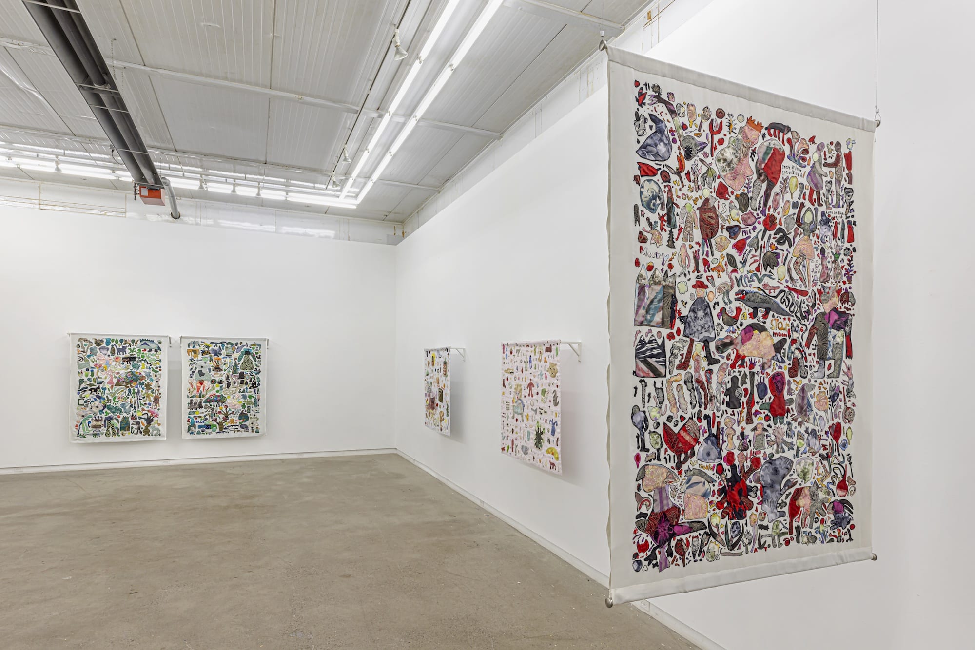Upon entering the gallery, I encountered panels of textile and paper populated with vibrant, vibrating figures. The subjects are difficult to identify at first glance. In “Cold Nights” (2025), they include cowboys in ponchos, serpentine creatures, and various avian species, among other forms, created out of patterned fabric. The suspended cloth also features a variety of words: ‘Love,’ ‘Mercy,’ ‘Star,’ and ‘Moon.’ Like a puzzle, the components fit together. A second facet to experience is the visible stitching on the back of the work.