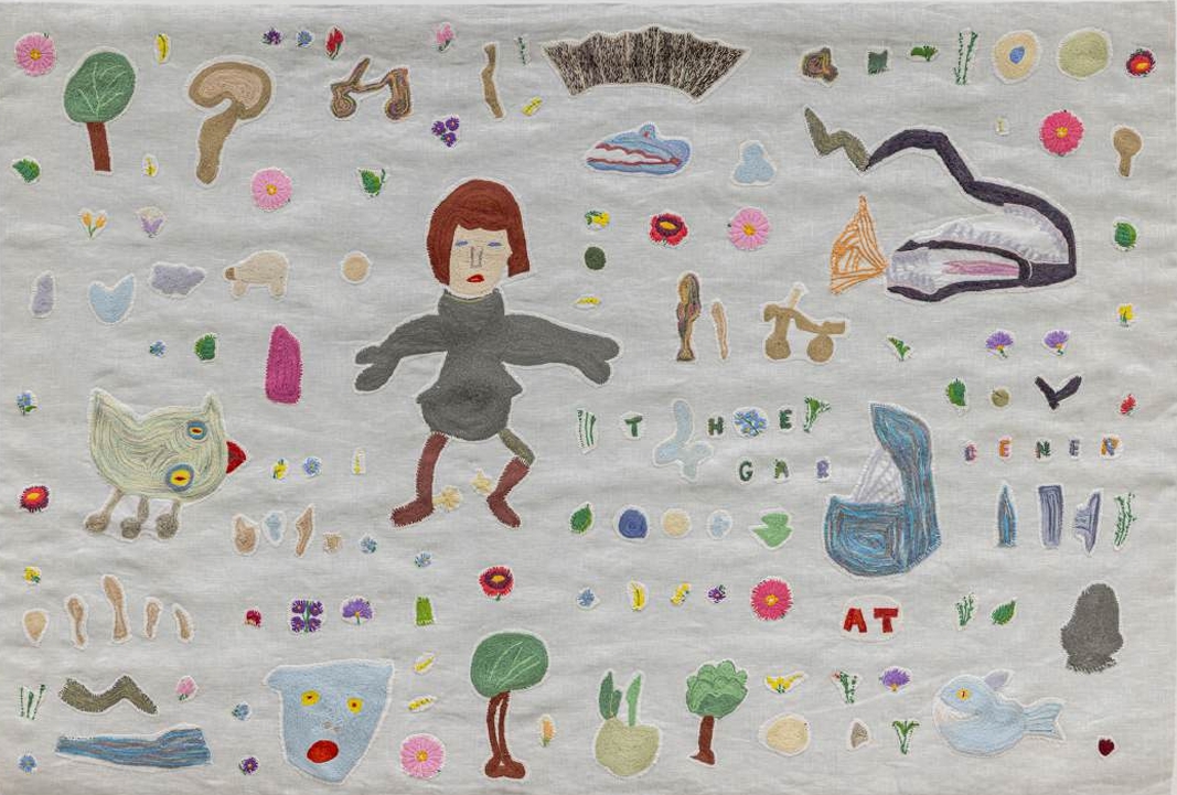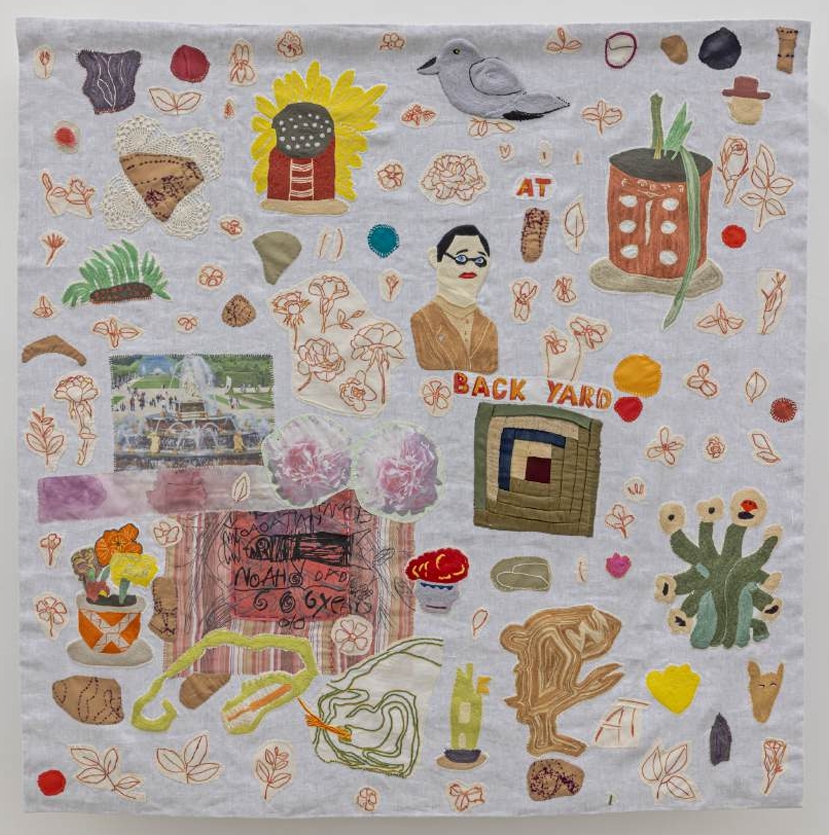 Anna Torma, Backyard, 2024, textile collage, hand sewing and embroidery on 2 layers of silk fabrics, silk thread, 48 x 49 inches
