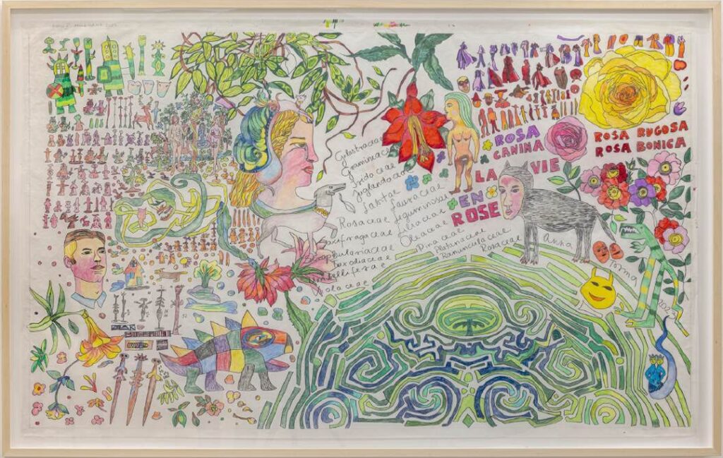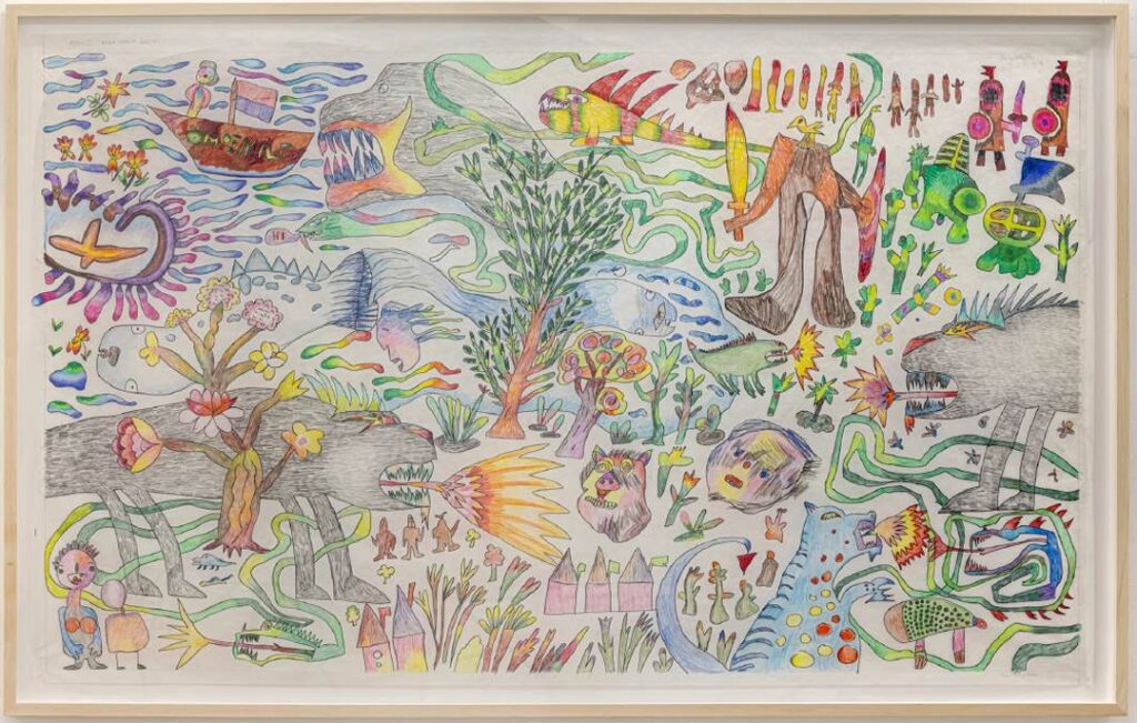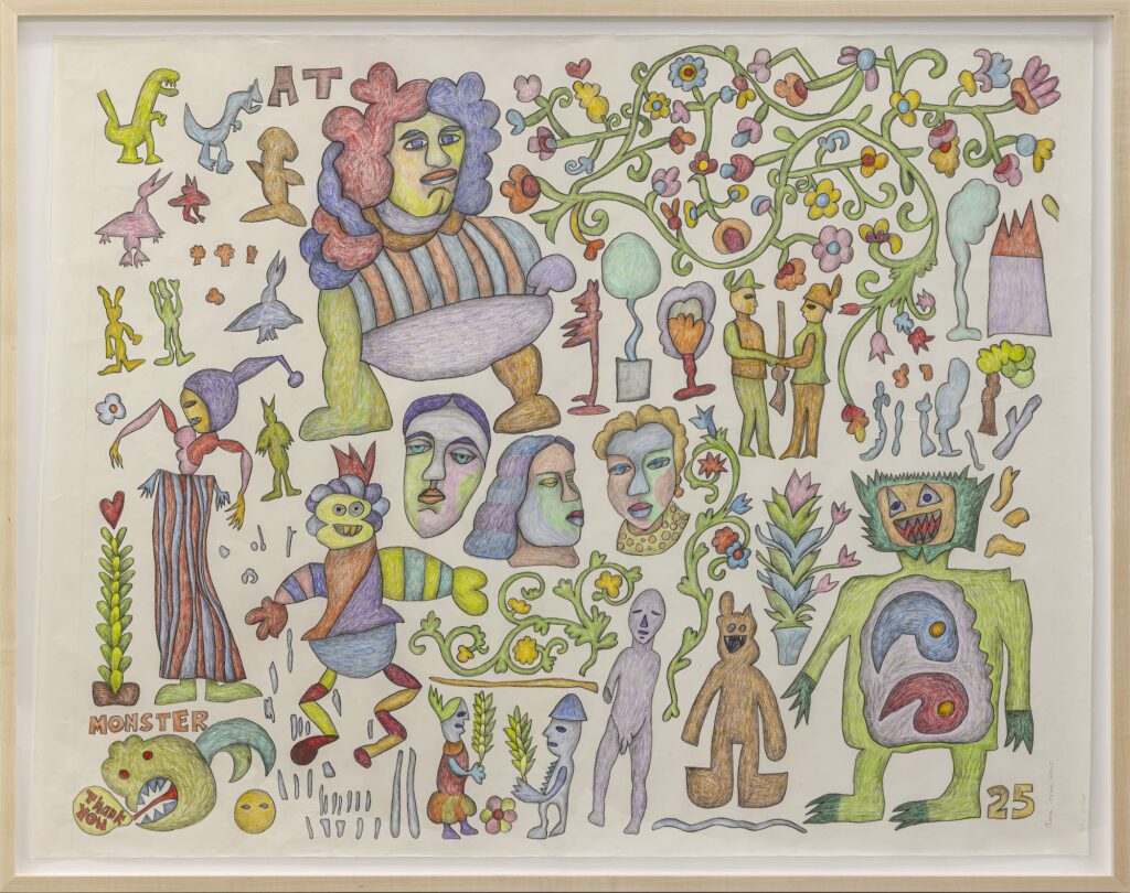 The exhibition features a variety of works: hand-stitched, embroidered, drawn and coloured in pencil. Some pieces are framed while others are suspended from the ceiling or mounted on brackets along the walls. Displayed adjacent to the entrance of the gallery is “Colouring Book Details II” (2025). The surface of the work is crowded with a mass of creatures that seem to be moving across the paper. The swarm of faces have a languid energy to them, eyelids half-closed, while the figures presented as beasts appear hyperactive, smiles full of pointed teeth. There is one in the lower left corner with an effusive speech bubble, exclaiming ‘Thank you.’ This introduction to The Eden Project considers what might have been in that garden— what exactly did Adam and Eve miss?