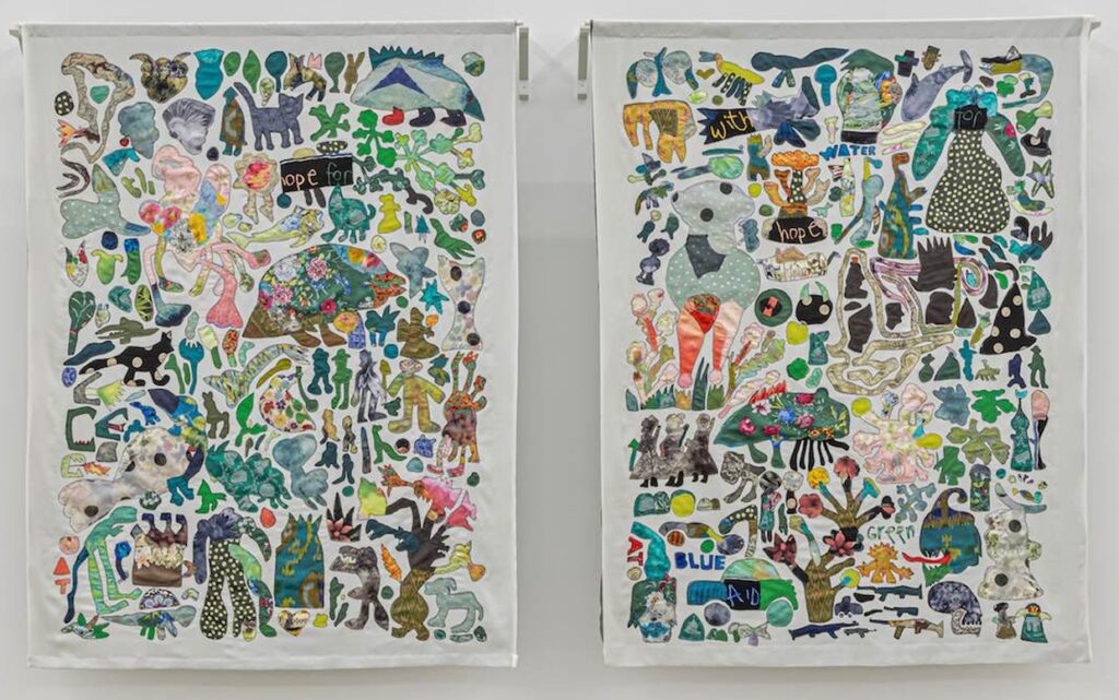 Some of the works are filled with vibrant energy like “Green Hope I” (2025) and “Green Hope II” (2025). These two textile panels also feature silhouettes of flora and fauna: dinosaurs, lizards, sharks, and cats. The medley of prey and predator is further amplified with the militant elements of soldiers, skulls, and weaponry.