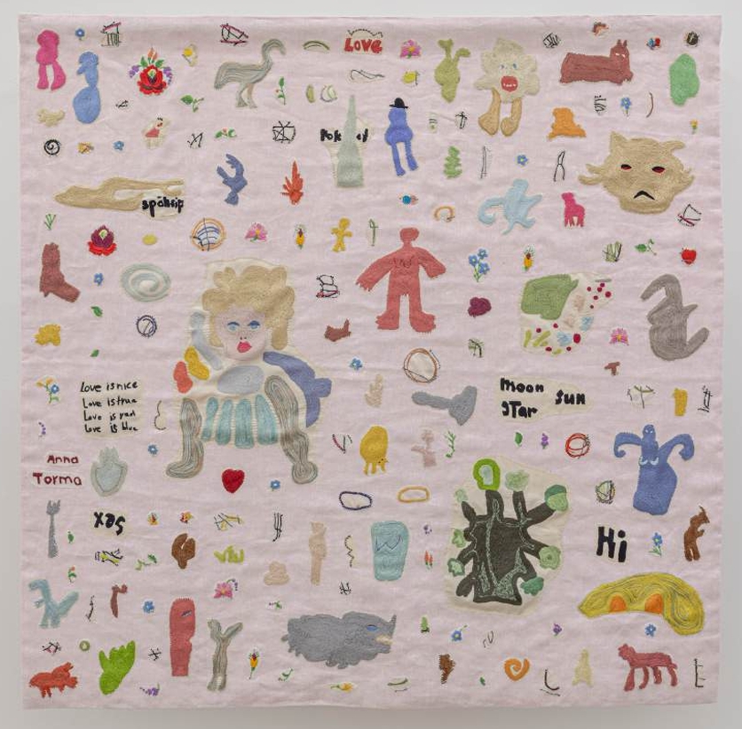 Making my way counterclockwise through the gallery, I view “Love” (2024), a heavily embroidered piece with a cherry blossom pink background. The subjects here are reminiscent of amoebas or other tiny life forms. What does love look like under a microscope, or in a petri dish? This is an apt visualization of the self as an assemblage of experiences, interactions, and relationships stitched together. Embedded in this work is the artist’s name, ‘Anna Torma’, conjuring reflections about what a name contains. It is a brand, a person. It’s the people you are named after, an indication of one’s culture, something to give to another person—how one exists in the world. The rocket and spaceship paired with the words related to exploration reminds viewers about how otherworldly and transformative love can be. Like Eden, it can be a new frontier.