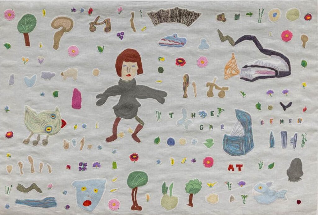 Anna Torma, The Gardener, 2024, hand embroidery with silk threads on 3 layers of linen fabrics, cotton flannel battling, 48 x 33 inches