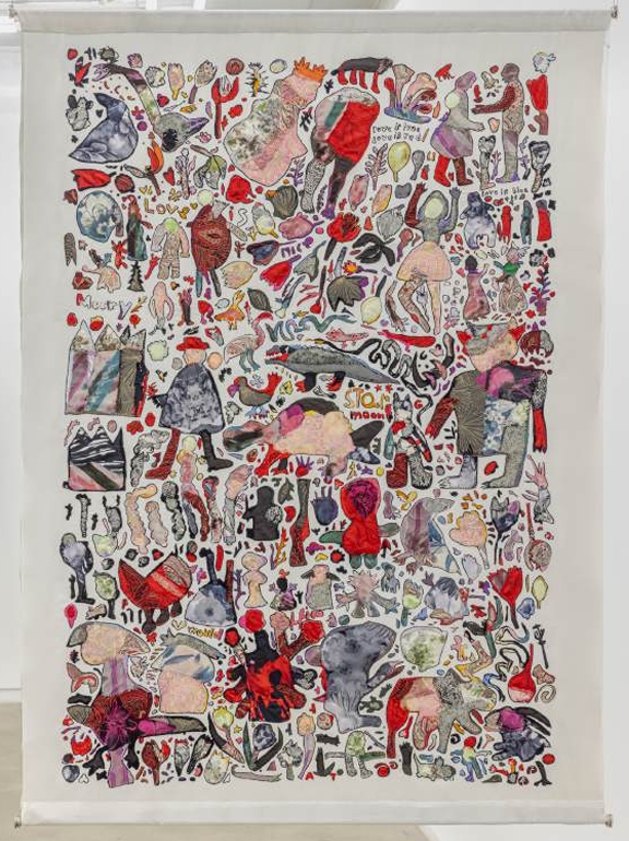 Anna Torma, Love, 2024, textile collage, hand sewing and embroidery on 2 layers of silk fabrics, silk thread, 48 x 49 inches
