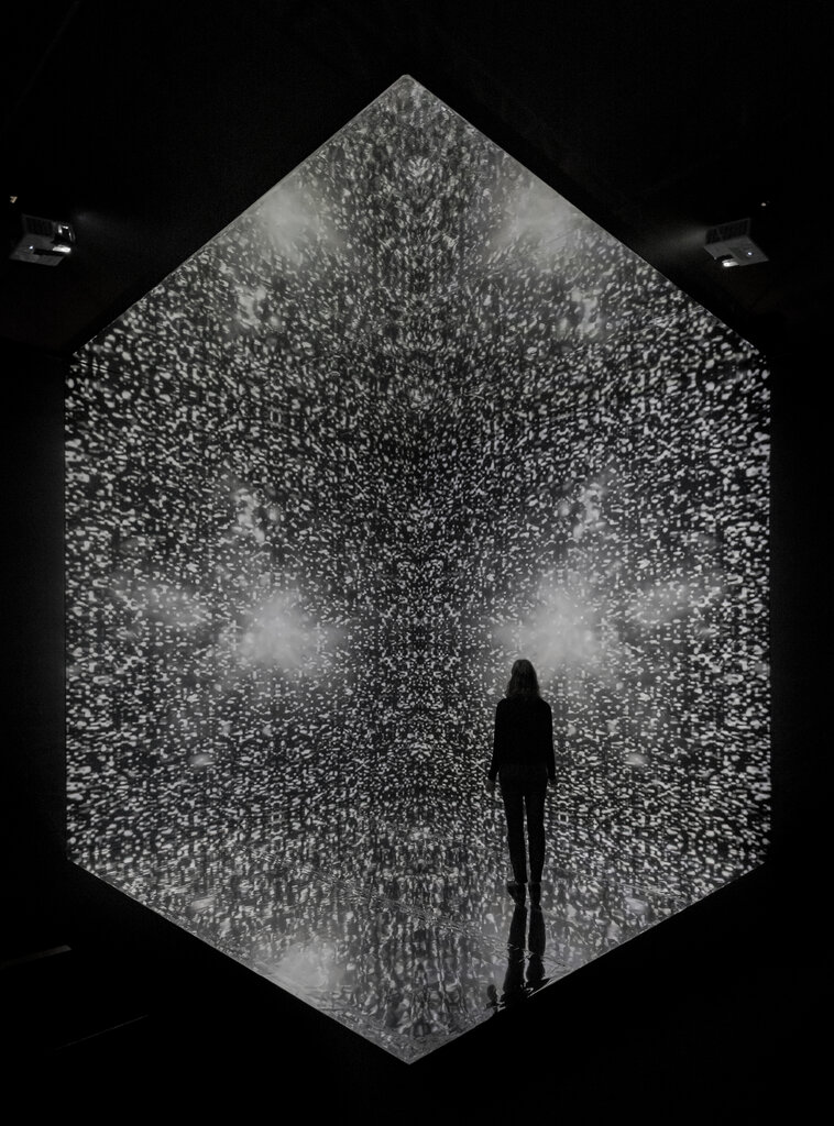 Stepping into the installation I am enveloped by darkness. It must be the beginning of the universe when nothing existed. Then some weak light grows, and I hang on to it with hope, as any little light is better than total darkness. Suddenly bright lights with impressive soundtracks surround me and it is almost too much, but I lose myself in this otherworldly installation and stop thinking. It surrounds me. As the story told by Elder Marie Gaudet (Turtle Clan Anishinaabe from Wikwemikong), a knowledge keeper and practitioner of healing songs and ceremonies, the installation invites us to reimagine creation. So, it seems I am inside the process of the creation that started, as the narrative says, with a single light emerging from the darkness. Am I swallowed by this installation? I feel I’m in the middle of it, totally absorbed by the darkening and lightening universe. It is a very complex world where dark, light, sound, narrative and music work together perfectly as I become part of the creation. It feels so good, uplifting and I am happy and amazed. Will I ever be able to leave it or do I want to stay inside and see what comes next? It is pulsating with energy, and I feel absorbed in it, an almost physical sensation. It is also very spiritual and mesmerizing. It was hard to distance myself from this installation and I needed some time to re-enter reality.