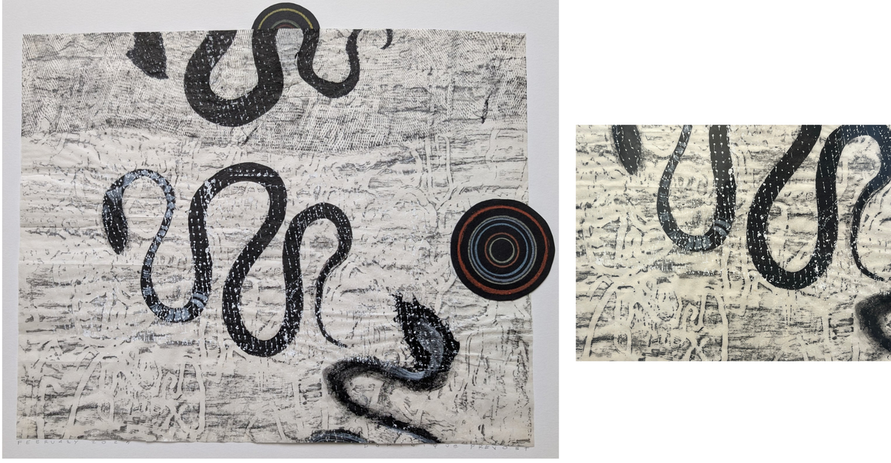 Dominique Prévost, Snakes, ink, graphite, colour pencil, 3 papers, 17 x 21 inches (left) and detail (right)