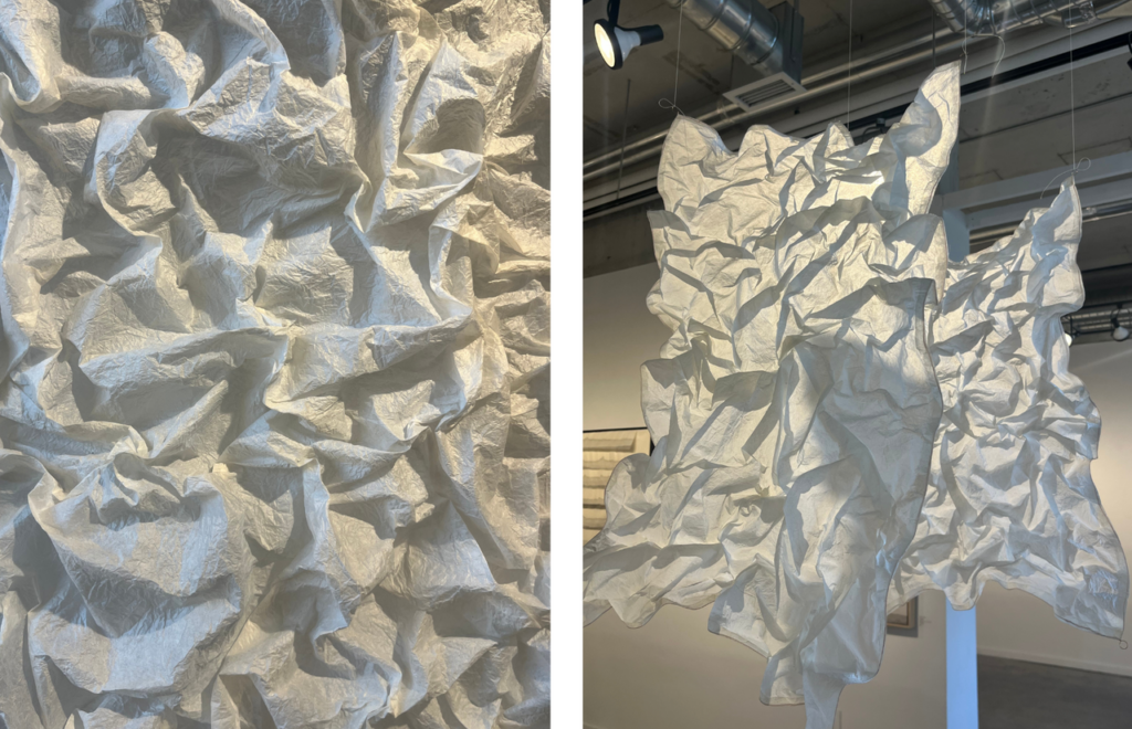 What interested me most in Susan Ruptash’s elegant composition of Four was the way light actively manipulates the viewer’s perception of the paper itself. The installation is not static; rather, it responds to its environment, revealing new subtleties as one moves around it. Depending on the angle of approach, the folds, creases, and textures catch light differently—sometimes casting shadows, other times glowing with luminosity. This dynamic relationship between material and light transforms the paper into something more than its surface, allowing it to oscillate between presence and absence. The four sheets, each deliberately crumpled and shaped, evoke a sense of in-betweenness—what might be described as a liminal space. They hover somewhere between order and disorder, as if capturing a fleeting state of transition. The paper appears to breathe, to shift, to hold memory. There is something deeply human in the way it folds into itself and simultaneously reaches outward like skin, and thought. Ruptash’s restraint in material and palette only heightens the contemplative quality of the piece, inviting viewers to slow down and witness the choreography between form, light, and time.