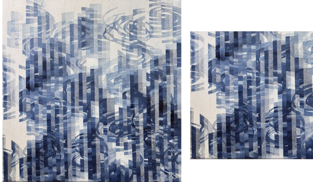 Heejung Shin, Faded, watercolor, pigment, Hanji on canvas, 12 x 12 inches (left) and detail (right)