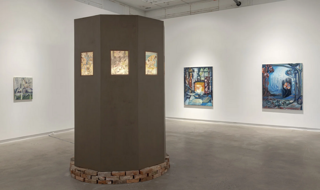 The centerpiece of The Spinner The Dealer The Assassin is a charming collaboration between the artists. Tower (2025) combines Smith’s bright, serene feminine world with Goodchild’s transformative structures.