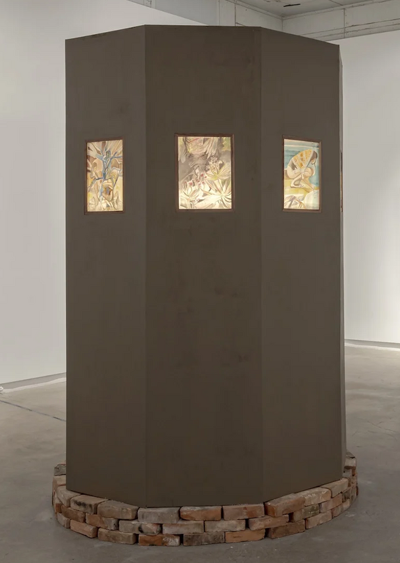 Heather Goodchild’s and Margaux Lenore Smith’s Tower, 2025, 6 x 6 x 8 feet. Exterior: ink and watercolour on silk; each 10 x 12 inches