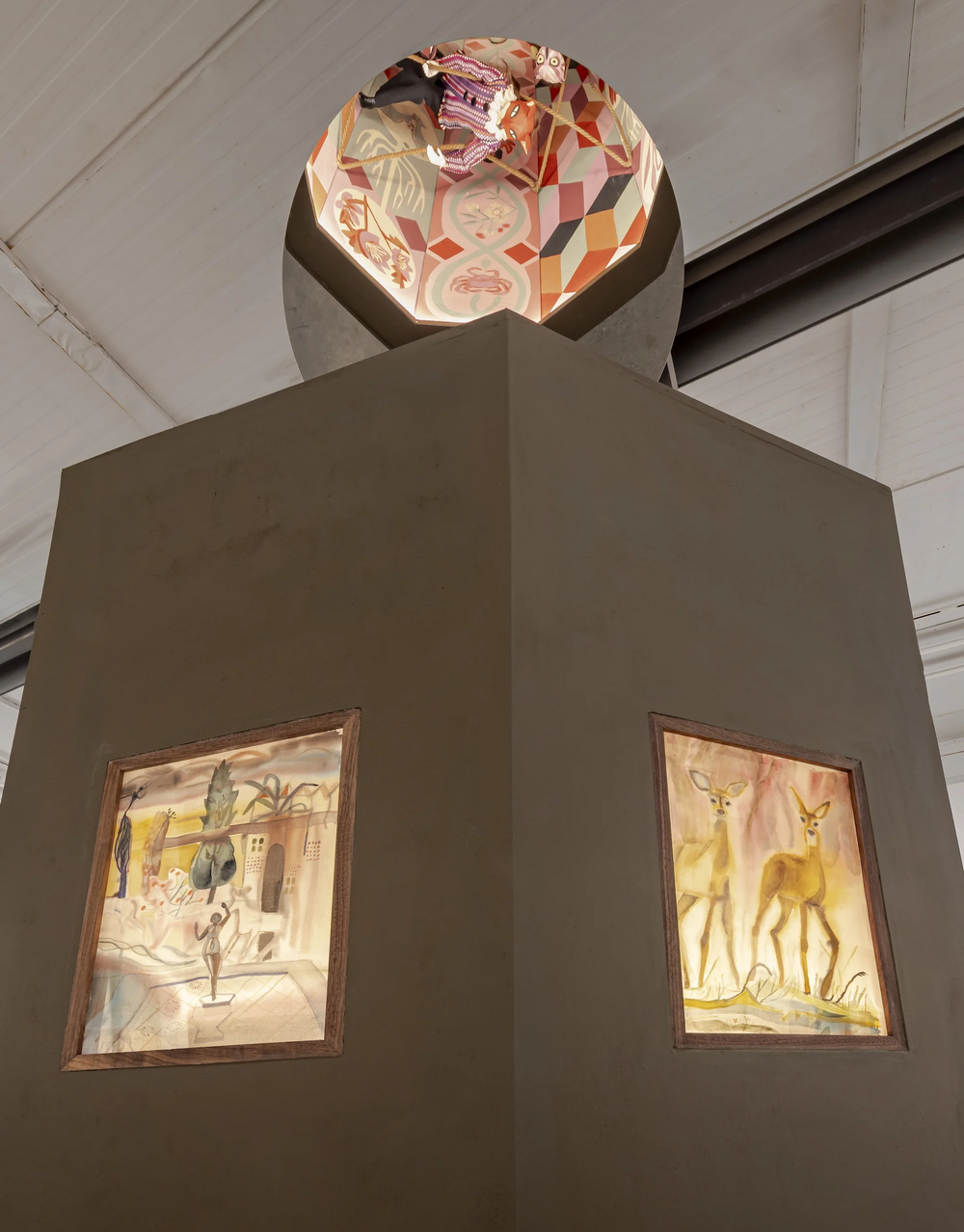 A series of watercolor scenes on silk screens by Smith adorns each side of the wooden monument. Within the structure, a more playful world emerges, revealed only by a small mirror positioned above the top, enabling viewers to contemplate this captivating creation. Together, the two artists have crafted a portal to a whimsical dimension where time is contained, uncertain, and perhaps, irrelevant, making Tower a counter-complementary message.