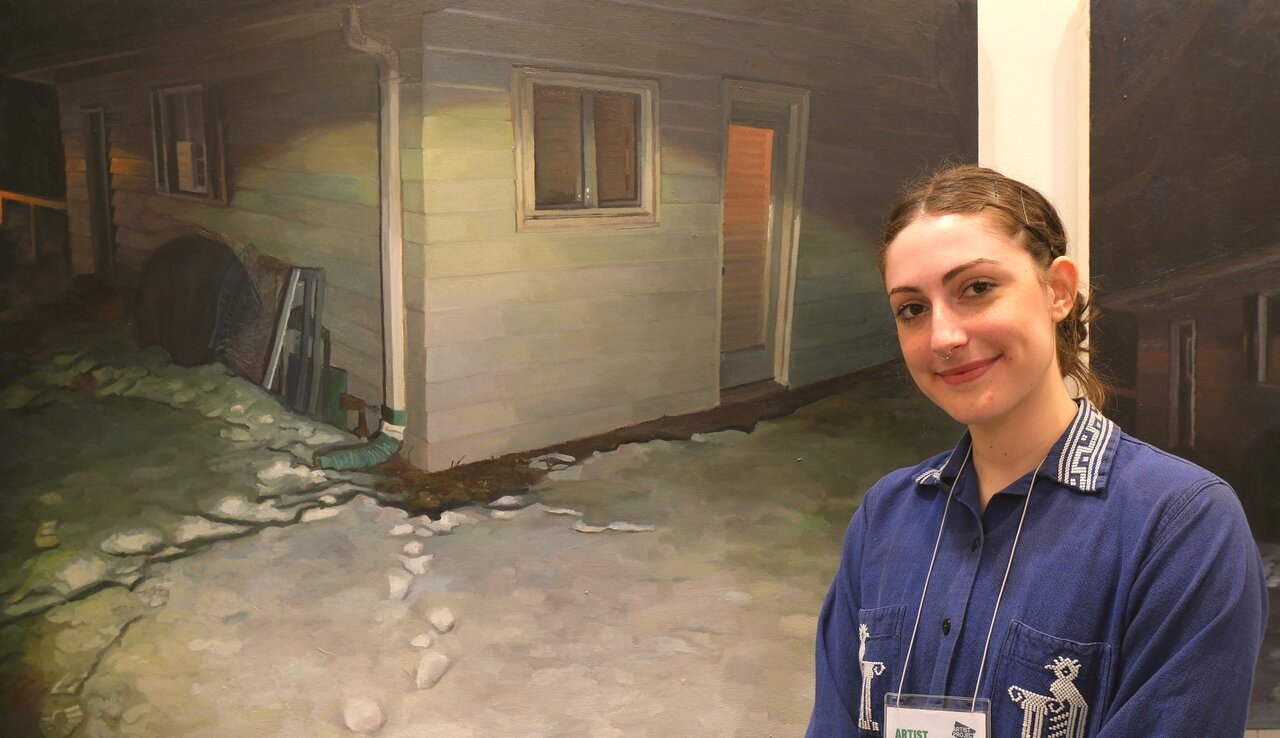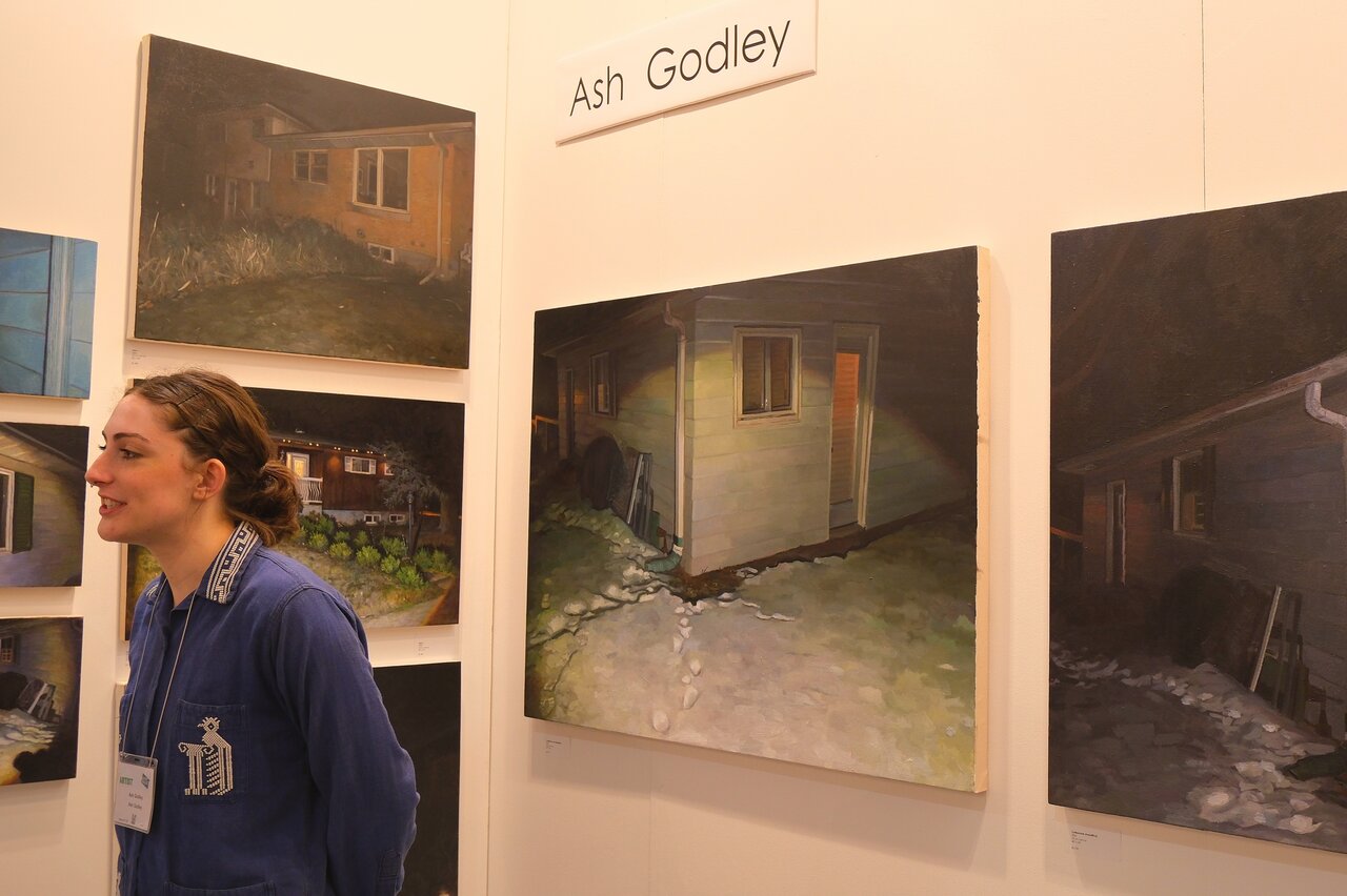 Emerging interdisciplinary artist and First in Show 2025 winner Ash Godley at booth 126 delivered one of the most strikingly cinematic experiences of the fair. Her oil paintings plunge the viewer into nocturnal worlds of stark contrast and unsettling familiarity. Drawing inspiration from game media, voyeurism, and the uncanny, Godley’s flashlight-lit scenes frame domestic architecture from the viewpoint of an unseen onlooker, often at night, always in the shadows. There is an eerie magnetism to her compositions: beams of light slicing through darkness, revealing just enough to stir curiosity and dread.