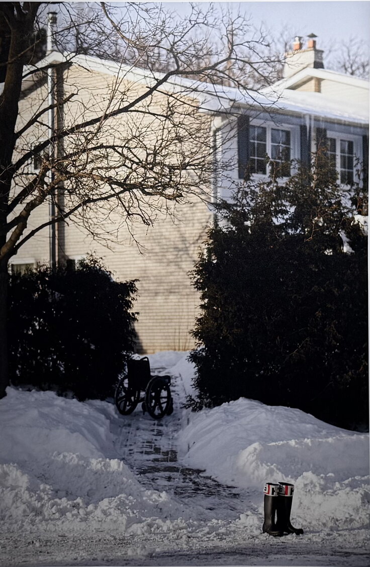 It is interesting how mobility devices are depicted in this show. Are they also an ‘extension’ of the body? Due to the shadowed settings that form the background, these mobility devices are inconspicuous. Viewers often see the footwear prior to the equipment. However, within works such as Turtle Or Rabbit Speed (2019), the footwear and the wheelchair both appear clearly to the viewer. The photograph is a winter scene, the snow creating a stark contrast between the background and the objects. There is a pair of lined Hunter boots at one end of the pathway leading to a home. In the middle of the shoveled path is a wheelchair. The Hunter branding of white, red, and black is recognizable for its popularity within Wellington boots, seemingly popping out of the photograph. Both the boots and the wheelchair represent a mode of travelling. In the boots you can move fast, while in the wheelchair your movement is somewhat limited. Or they might belong to the same person.