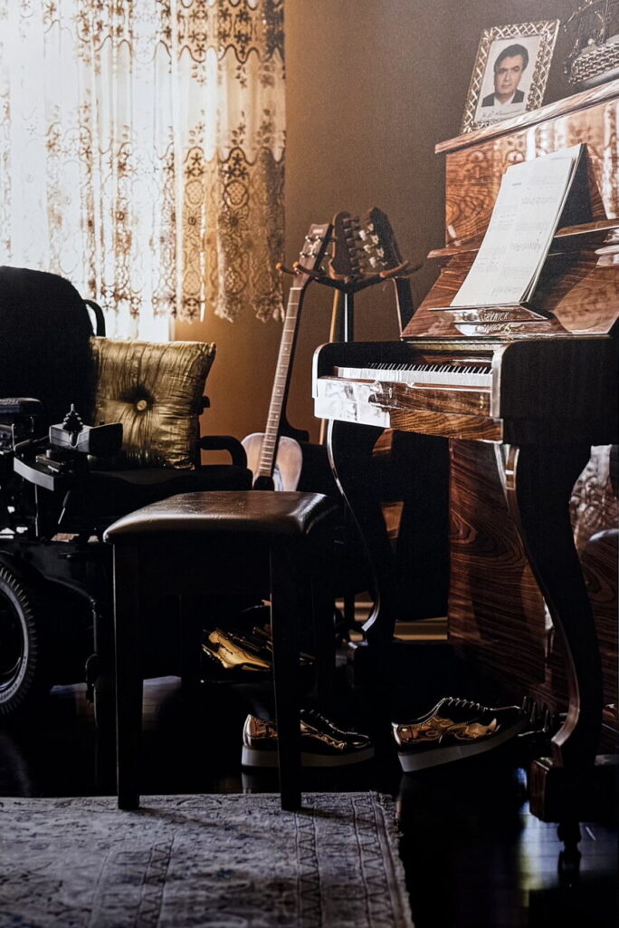 The warm tones of the interior are very inviting in Inspiring (2017). The shoe-subject in this work is a pair of metallic loafers, with a second pair in the background. It seems like it is applying gentle pressure to the pedals of the piano as if an invisible figure is sitting down to play. Signs of home are found in the scene: a family portrait atop a mantle, a stand of four guitars, an ornate rug with dust motes suspended in the air. There is also a wheelchair and a comfy armchair nearby. This room must belong to a disabled person with good taste, who is also a music lover and a player – showing that disability doesn’t always make a person unable to fulfill their dreams.