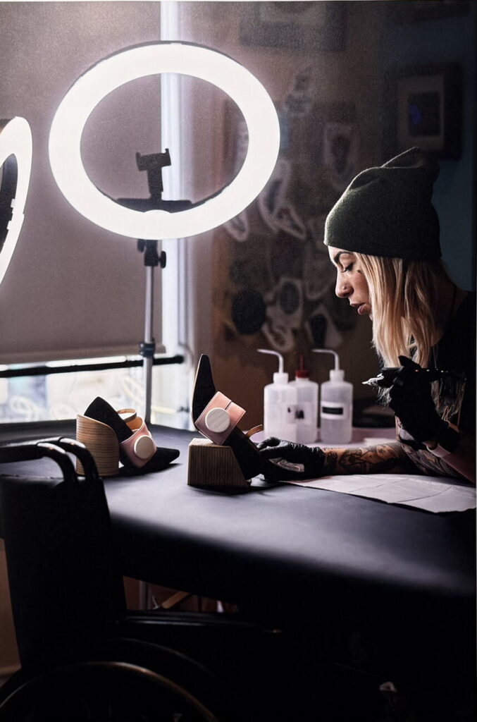 One of the first objects we encounter in Step Into My Shoes is a pair of black heeled boots embroidered with red, white, pink, and green floral patterns enclosed in a glass case. The exhibition is on three floors. Each floor presents three to four photographs in addition to actual footwear presented in a glass case that appears in the photography, such as the pair of pink Jacquemus block-heels in Its An Extension of Her Body (2019). This work is uncanny in its depiction of shoes and the tattoo of the woman’s arm, highlighted by multiple ring lights. Like tattoos, shoes and other adornments are expressions of style and taste and tell a lot about the person wearing them.