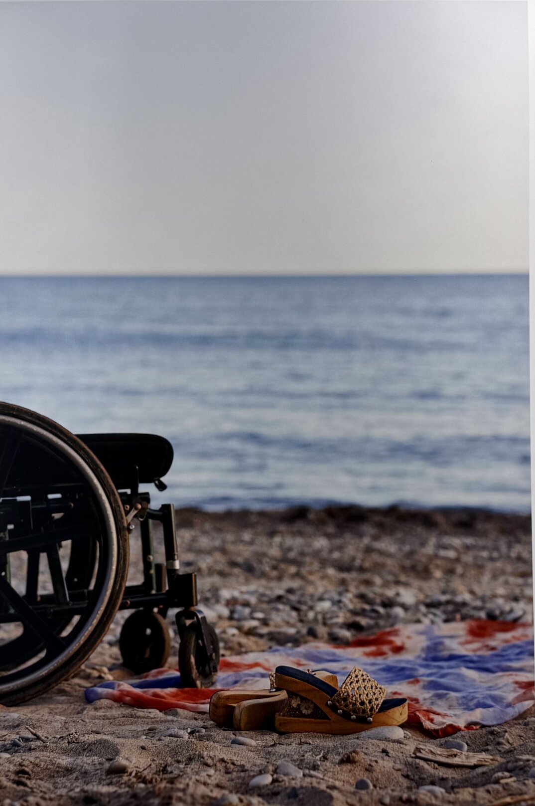 The shoe-subjects resurface in settings such as piers or beaches, the latter forming the background in Pop A Wheelie (2017). This photograph shows the wheel of the chair in profile, almost as though it is contemplating the water. On the sand in front of it is a tie-dyed blanket along with a pair of wedge sandals with wicker details. The smaller adornments of beads and flowers are also visible, emphasizing the coastal vibe. Where is the person who came here in the wheelchair? Does she still have some mobility to walk around, or even swim? Or is that person photographing this scene for future memories?