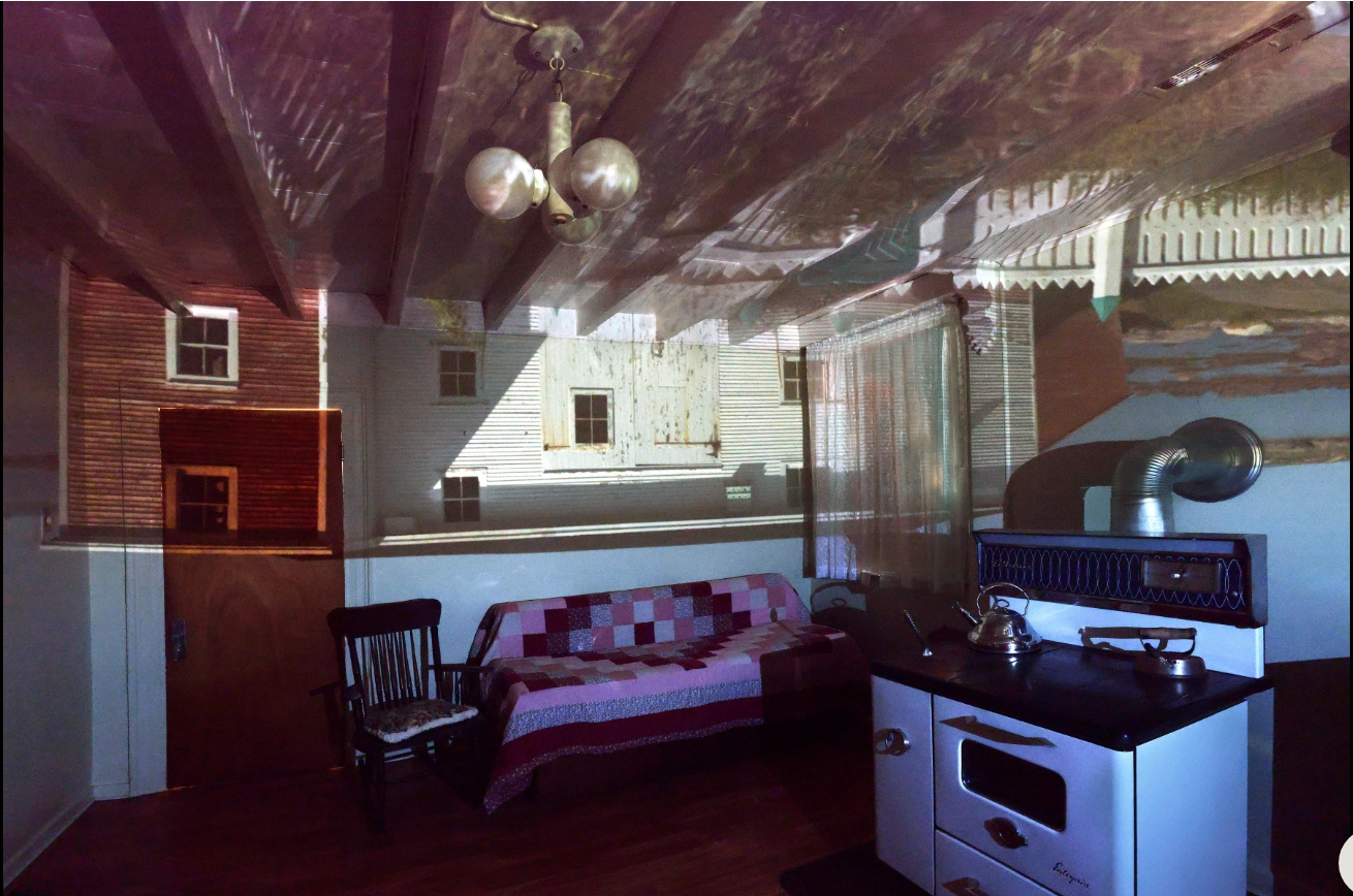 Gary’s Place, Living Room (2019) is a comfortable space with a couch and framed pictures on the wall, that are overlapped with the landscape. A piano at the wall suggests that he is a music lover. His story is very different from Loretta’s. I am aware that I am creating my own narrative here, and I am sure everyone else will do the same. It is a good thing to be so deeply involved in the image.