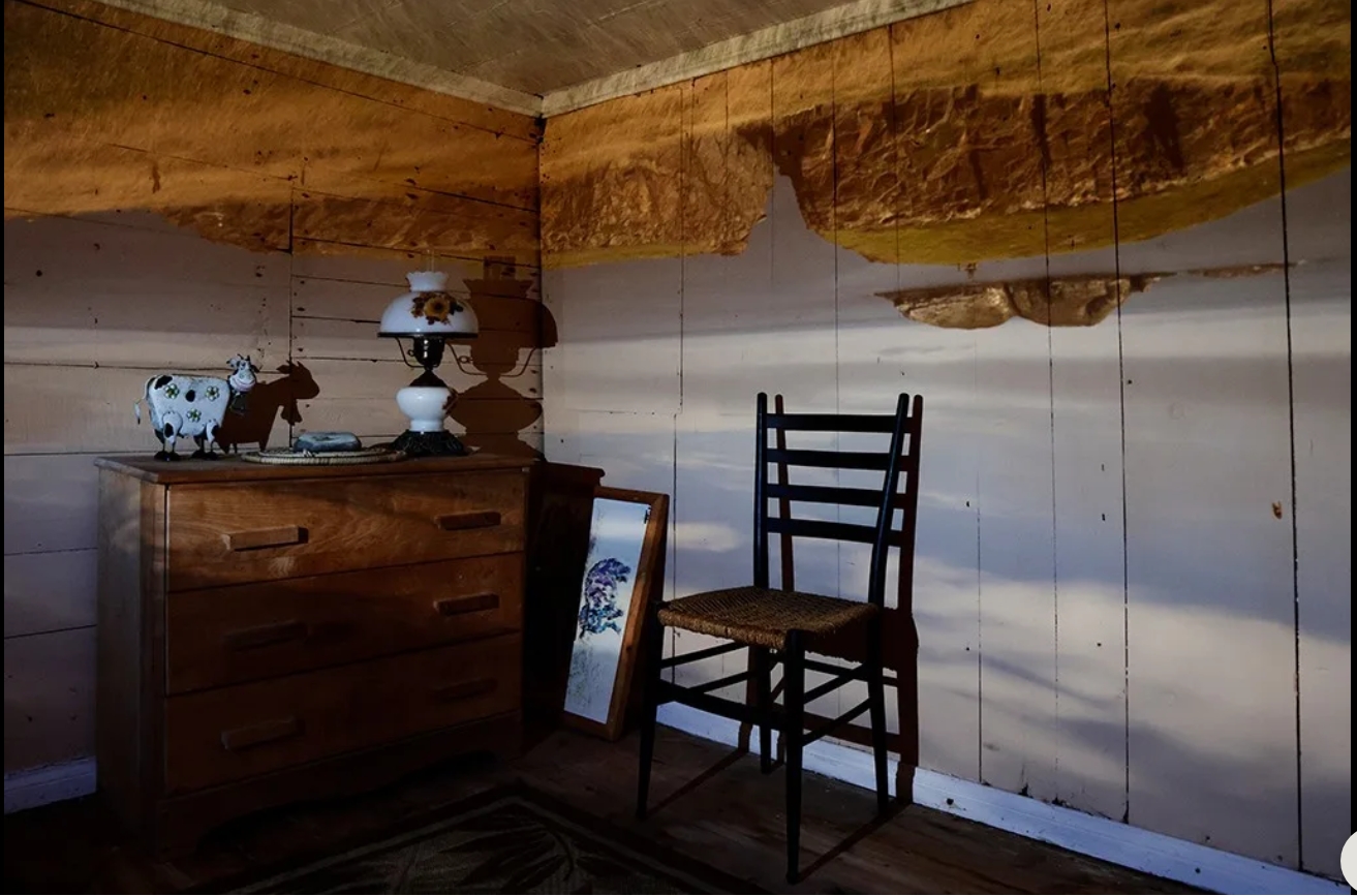 The title of the exhibition What Time Is This Place?, is very important. The photographs depict the rural landscape of Newfoundland in reality, as an outpost with common buildings. How do those people get here? Why? Is it an escape or a conscientious choice? Do they fit in or misplaced? We can guess their history, past and present and their social status. In Loretta’s Place the bottom of the walls in the room are sky-blue, the landscape is green, the buildings are yellow and white while the floor, the bed and the ceiling are dark, creating a dramatic contrast. The bed made me think of possible interactions between objects and people. It is just the frame, hinting at the absence of a person. But what does an absence really mean? Years ago, when I moved into my apartment, there was abandoned furniture in it that an old person left behind. For some time, I felt the presence of him, like a imprint of his memory was still there. The same is true for Galbraith photographs. Loretta might be a poor person, in a small, rural place, who still needs to buy a mattrass and bed clothes. Very little else can fit into that tiny place. I think she is somewhat misplaced. This room can’t be the place she dreamed about.
