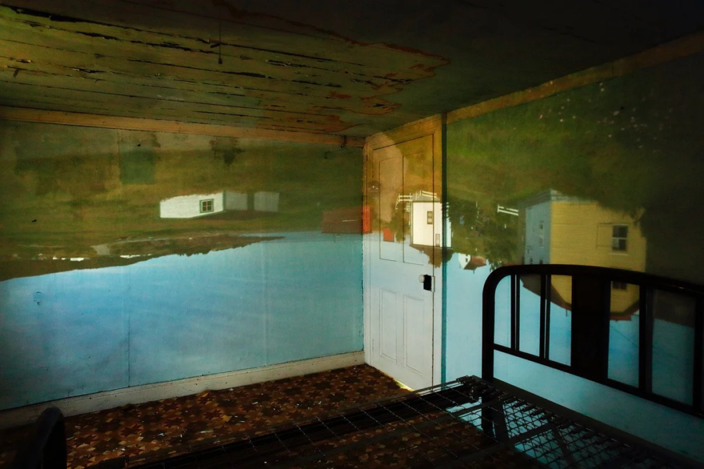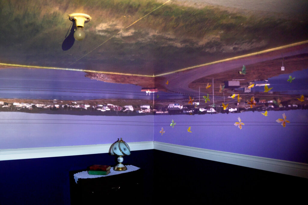 There are two different worlds combined into that one image of a rather abandoned looking room with a bedframe, as though someone had just departed or the room was waiting for a new occupant. There is a rug on the floor and wood we expect to see on the floor now on the ceiling. But what makes this image unique is the upside-down landscape on the walls. Galbraith used a camera obscura when photographing the landscapes in Newfoundland, so the images are inverted. But it is much more than that. Neither the room nor the rural landscape is interesting in its own. However, through combining them in this way, they undergo a metamorphosis. The interior opens and the landscape becomes part of the room, but not like a picture on the wall. Grass grows, buildings emerge, and we no longer know when the inside ends and the outside begins. Inside and outside become one, a mesmerizing symbiosis.