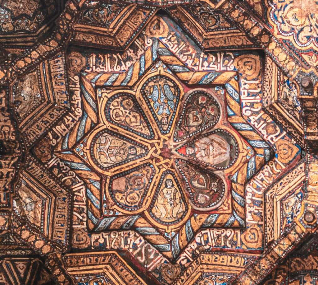 Another panel is of the Capella Palatina in Palermo, Sicily, Italy. Completed in 1140, this wooden and painted muqarnas was commissioned by Norman Christian monarch Roger II. The intricately designed cells depict scenes of mythical creatures, gardens, animals, and court life. It is a rich blend of Fatimid, Byzantine, and North African influences and serves as a representation of Roger II’s multicultural ambitions. Around the cells are script in Kufic, an acknowledgement of the monarch’s power and prosperity.