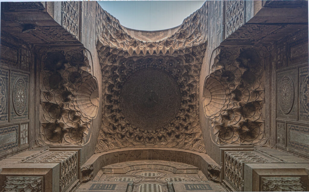 The first panel features the muqarnas above a domed portal to the Al-Rifa’i Mosque in Cairo, Egypt. Completed in 1912, this stone muqarnas is designed in a Neo-Mamluk style, characterized by its tall portals, minarets, and domes, its creative floor plans, and its elaborate use of ablaq, a technique of alternating different colours of stones for visual effect.