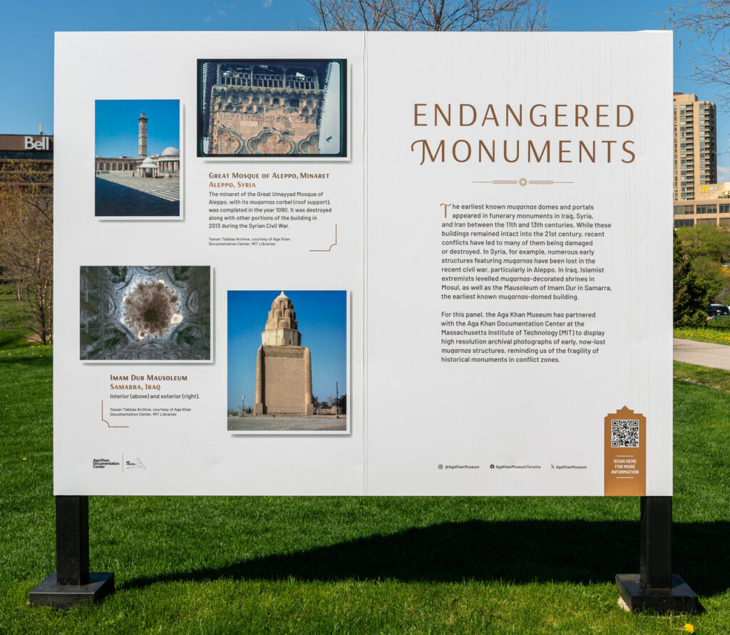 Further along the path, the project shifts into a photographic reconstruction of great ambition and intention. Entitled Endangered Monuments, this panel calls attention to the threatened and destroyed Islamic buildings, either at the hands of extremist iconoclasts or war. To truly emphasize their significance and fragility, the Aga Khan Museum partnered with the Aga Khan Documentation Centre at the Massachusetts Institute of Technology (MIT) to retrieve documented archival photographs of razed muqarnas structures. This panel honours and preserves their architectural splendor.