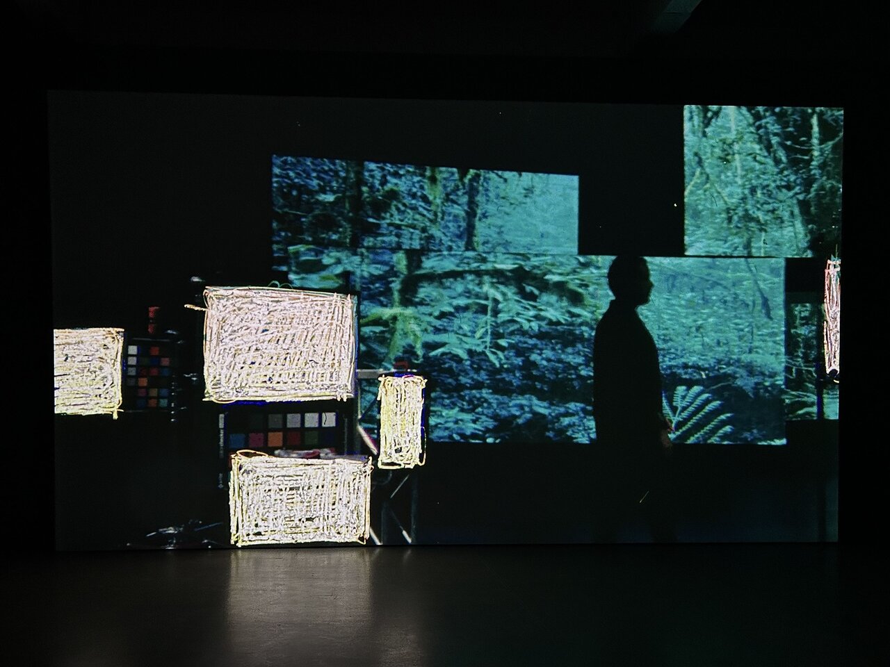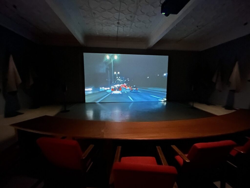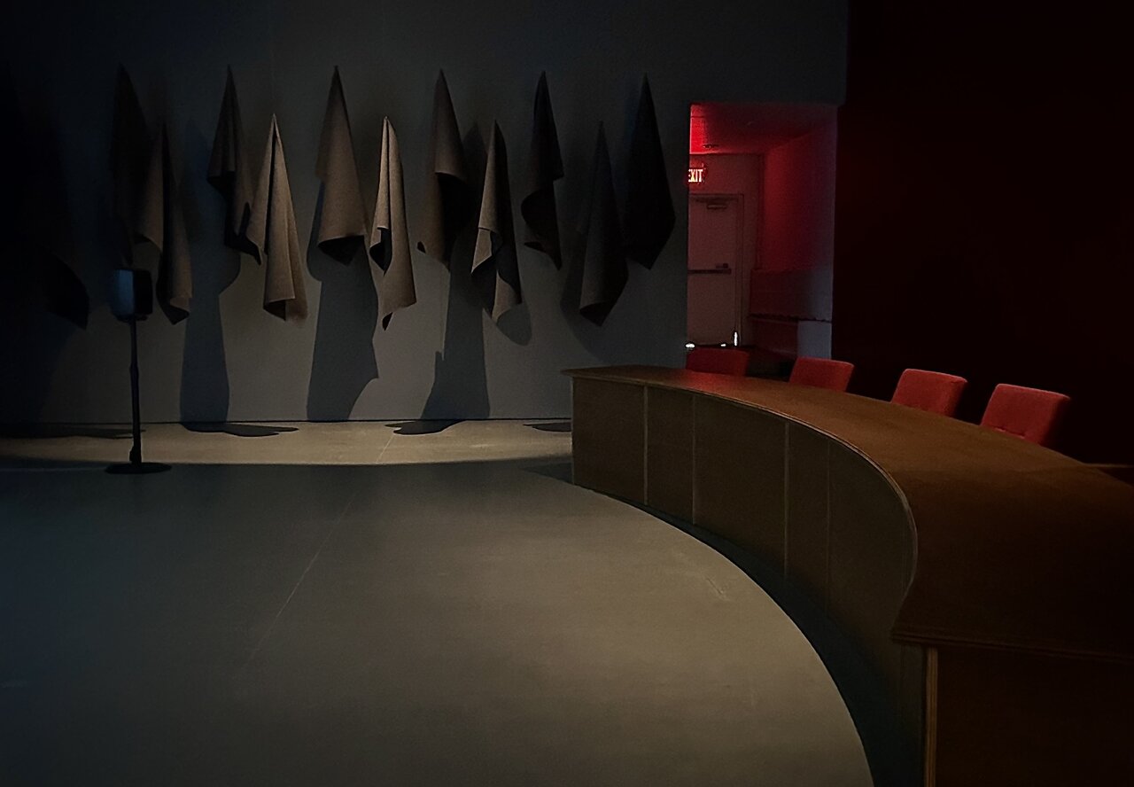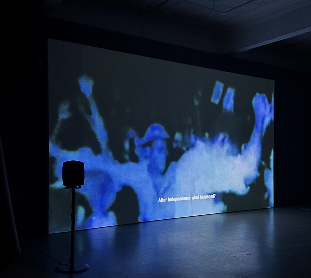 The audio was the most staggering and impactful experience for me; one could close their eyes and still feel the same level of emotion from the dialogue, music, the drumming, and the whole audio curation. The language the artist employs throughout the film is familiar and personal, but still, there is pain embedded into the piece that is palpable in the room. Framing the projection of the video, there are 29 acoustic felt sound blankets that are representative of the 29 flags that were present at the Bandung Conference in 1955. The absence of any iconography of the flags gives the floating fabrics a phantom essence. It is hard to ignore the presence of ghost-like figures in the room, from the ghostly flags to the conversations with those who were taken from us, and the phantoms of a hope for freedom.